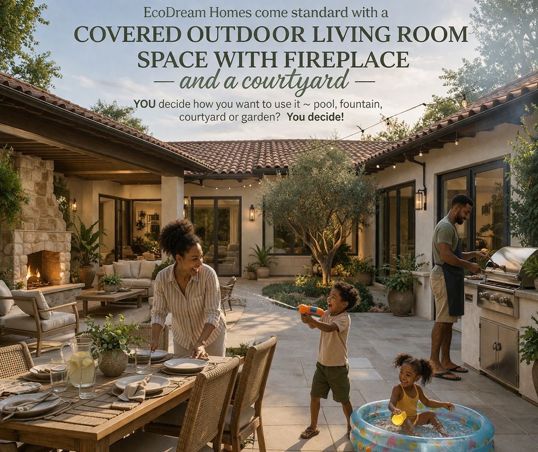 EcoDream Homes come standard with a covered outdoor living room space with fireplace and a courtyard YOU decide how you want to use it ~ pool, fountain, courtyard or garden? You decide!