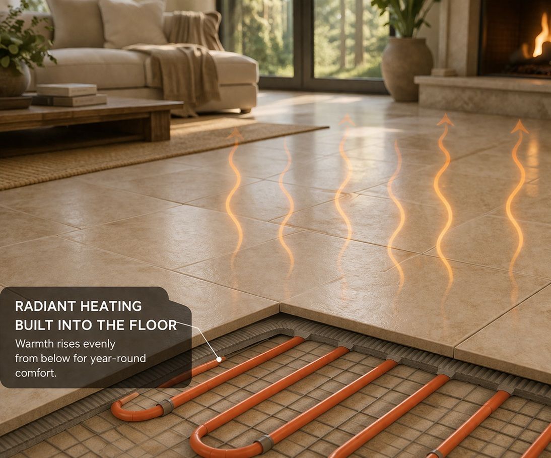 EcoDream Homes come standard with radiant in-floor heating to ensure the house is warm throughout the cold months . No gas. No dust. And yes, even the bathroom floors are heated!